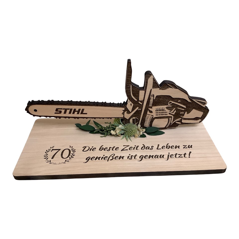 Motorsäge aus Holz auf Unterteller mit Spruch . Motorsäge Länge 30cm , Breite 13cm aus 1cm dicken Erlenholz hergestellt. Unterteller Länge 31cm, Breute 14cm ebenfalls aus Erlenholz hergestellt. Auf Wunsch gerne mit einem anderen Spruch oder anderen Namen , Geburtstagzahl usw. möglich. Bitte kontaktieren sie uns diesbezüglich per E-Mail oder Telefonisch.